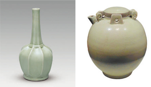 陕西法门寺地宫出土的秘色瓷净瓶(左)、浙江钱鏐墓出土秘色瓷夹耳罐。 郑建明供图