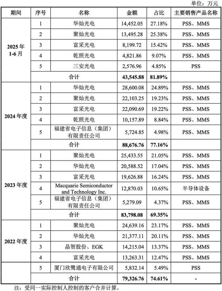 2022年、2023年、2024年、2025年1-6月,中图科技向前五大客户的销售收入占营收比例分别为74.61%、69.35%、77.16%、81.89%。