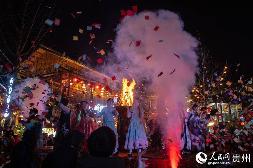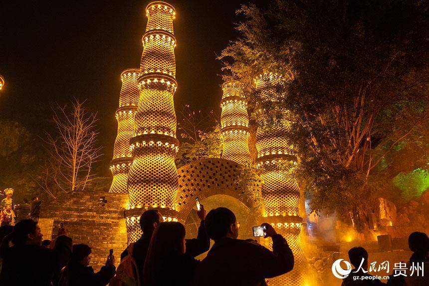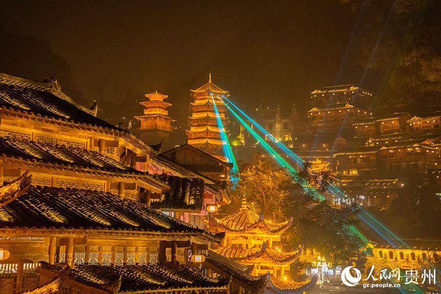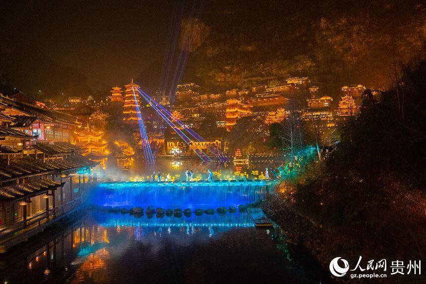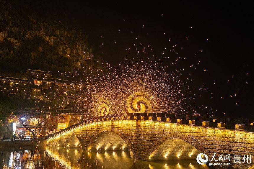流光溢彩的峰林布依夜景。人民网 阳茜摄人民网兴义2月8日电(高华、阳茜)年关将近,夜幕降临,位于贵州省黔西南州的峰林布依景区依然灯火璀璨,热闹非凡。园区内一场被誉为“最古老烟花”的非遗打铁花表演在这里震撼上演,漫天金雨与流光溢彩的布依夜景交相辉映,在冬日里焕发出别样生机。